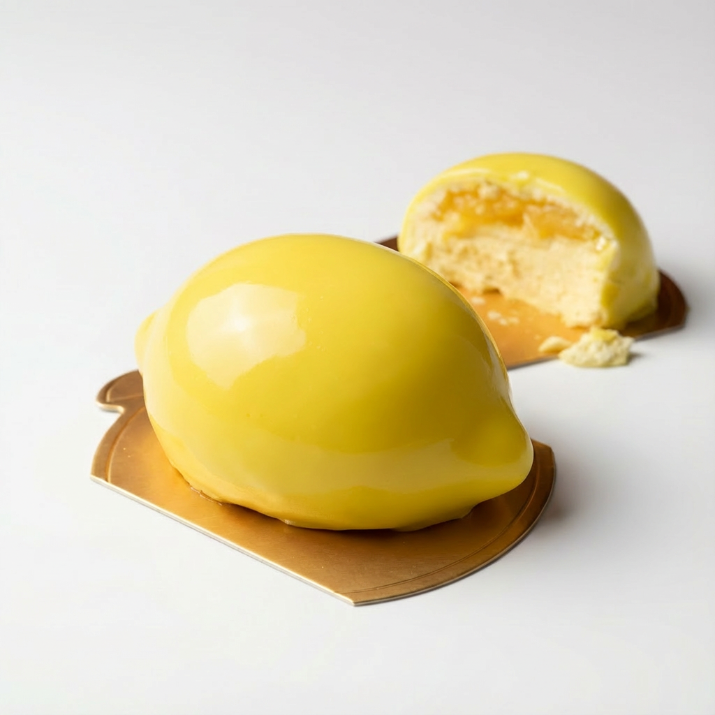 Hinter der detailgetreuen Schokoladen-hülle offenbart sich eine cremige Zitronen-mousse, getragen von einem aromatischen Zitronenkern. Ein Dessert, das Ästhetik und Geschmack in luxuriöser Vollendung vereint.